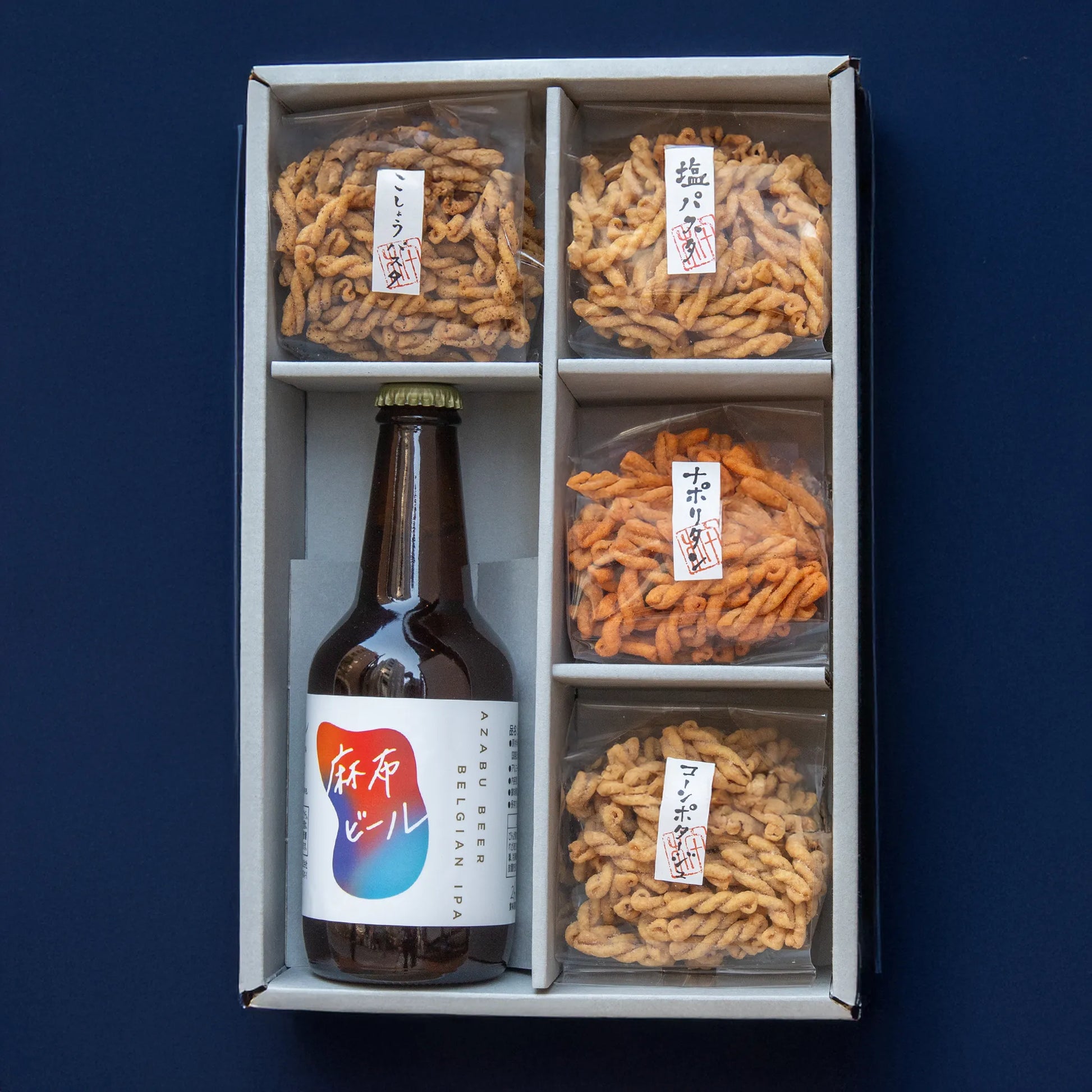 オリジナルのブクラフトビール"麻布ビール"と、麻布十番 杵屋のロングセラー商品"揚げパスタ"を彩りよく詰め合わせた、冬の贈り物として最適なギフトセットです。