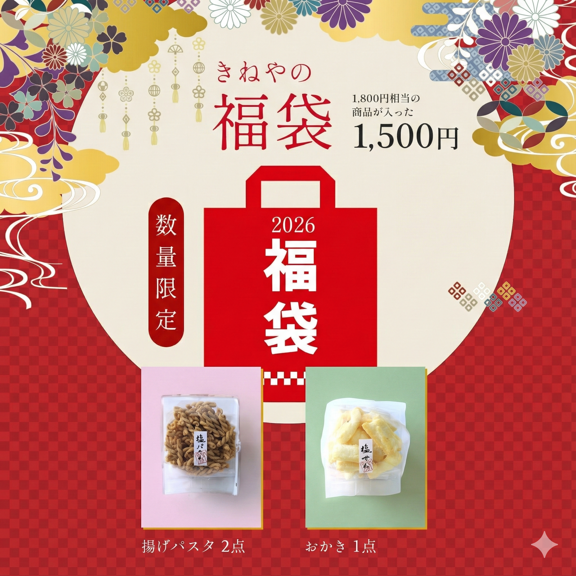 この福袋には、当店自慢の揚げパスタ2点と人気のおかき1点をセットにしました。